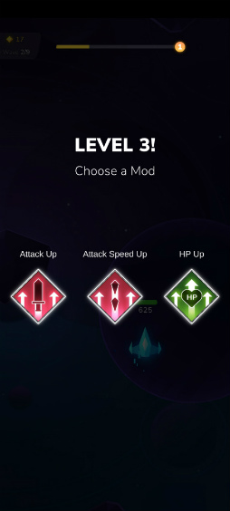 その際,「ショットの種類」「ショットの威力上昇」「自機のHP上限UP」など,ランダムで提示される3つの追加効果の中からひとつを選択できるので,好みの成長要素を選び,自機をカスタマイズしよう。