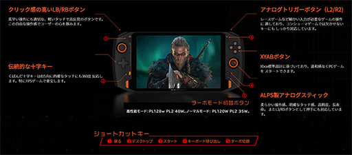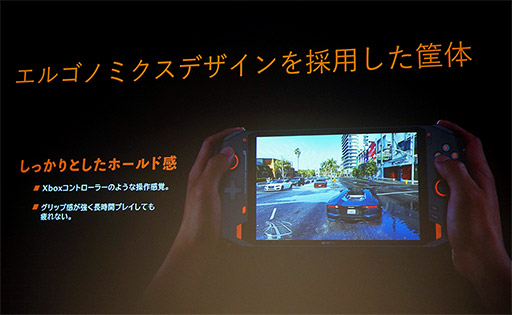 ディスプレイの左右に組み込まれたゲームパッドは,本体の左奥に左アナログスティック,右手前に右アナログスティックを備えたXbox純正ゲームパッド風のレイアウトを採用する。