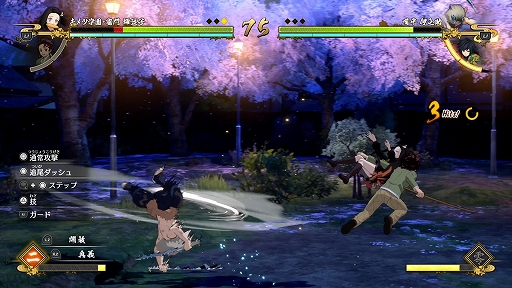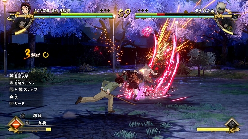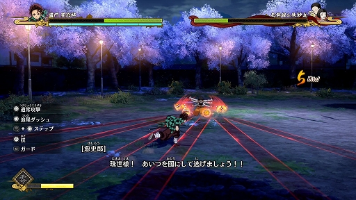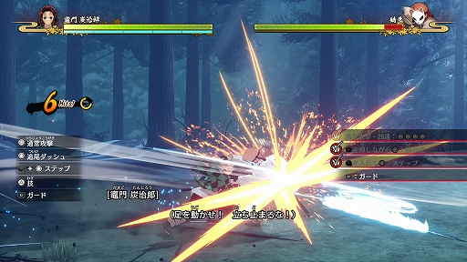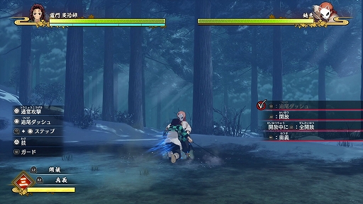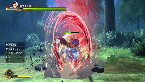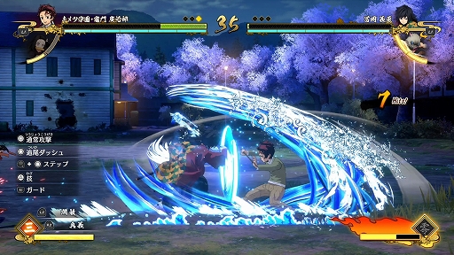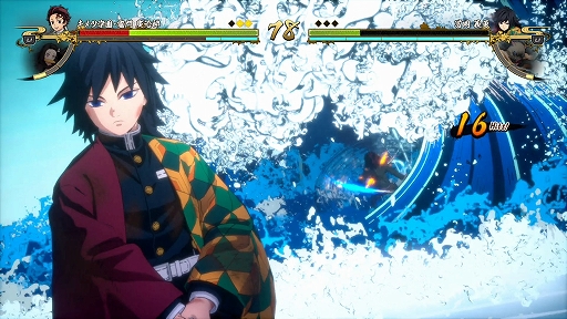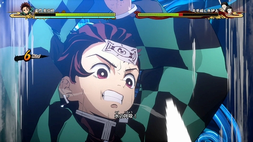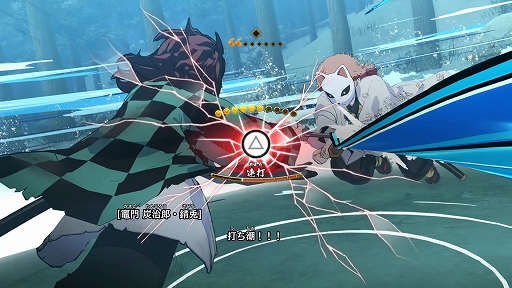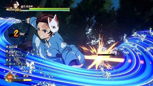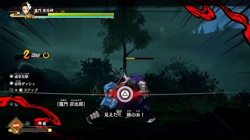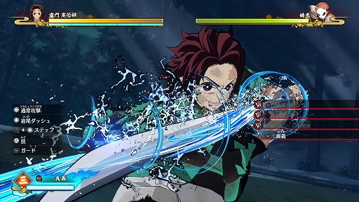 また,大技となる「奥義」も[R2]ボタンを一押しするだけで使える。炭治郎の奥義は「拾ノ型 生生流転」で,発動するとカメラアングルが変わり,アニメさながらの演出とともに技が繰り出される。これに加え,[○]ボタンを押せば相手の方に向かって自動で走る「追尾ダッシュ」が発動し,[R1]ボタンを押すだけで掴み技を除いた攻撃をガードできるなど,対戦ゲームに慣れていない人でも意識せずに楽しめる仕様になっている。