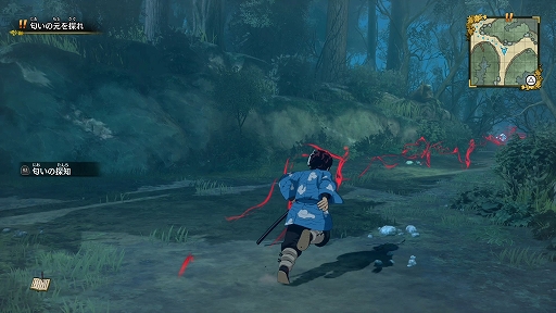 「匂いの探知」を使うと,鬼が発する匂いの痕跡が見える。これを頼りに進み,鬼を見つけるとそのままバトルに移行する流れだ。