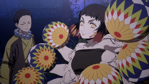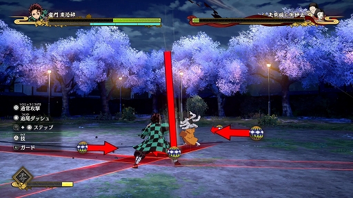 今回体験できたボス戦は,矢琶羽&朱紗丸戦で,炭治郎で戦うパートと禰豆子で戦うパートに分かれている。朱紗丸が飛び道具である鞠を放ち,それを矢琶羽が血鬼術で自在に操る強敵だ。炭治郎は札を通じて愈史郎の視覚を借りているので,鞠の軌道は矢印として見えるものの,不規則に動き回ってこちらを惑わしてくるので,なかなかに厄介だ。