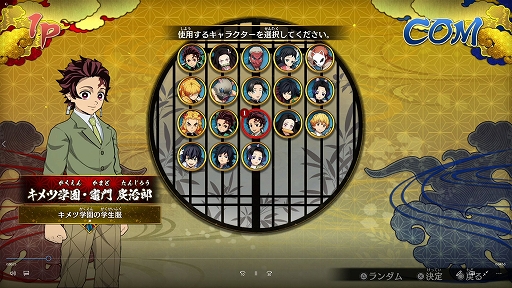 「バーサスモード」のキャラクター選択画面。公式スピンオフ「中高一貫!!キメツ学園物語」のキャラクターたちも登場
