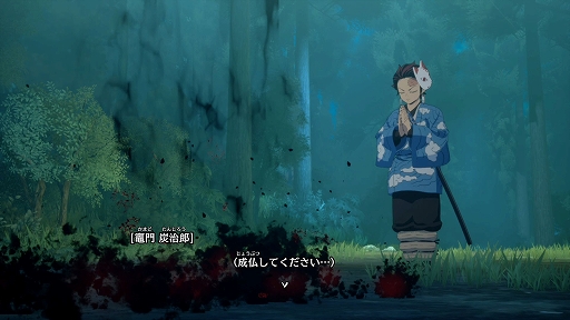 修行で手に入れた力で,鬼を倒した炭治郎。しかし,おごり高ぶることはせず,相手の冥福を祈る。地味ではあるが,炭治郎という人物を印象づける重要なシーンが,ゲームで取り上げられている