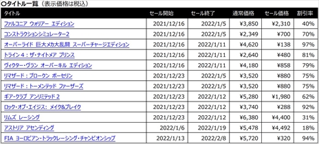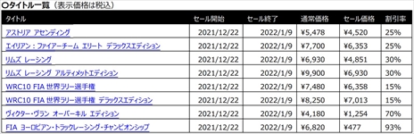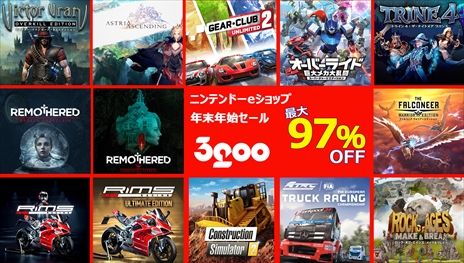 株式会社 3gooは本日、本日、ニンテンドーe ショップおよびPlaystation Store にて、『エイリアン:ファイアーチーム エリート』『WRC10 FIA 世界ラリー選手権』『アストリア アセンディング』など2021年に発売されたばかりの新作や、『ギア・クラブ アンリミテッド 2』『オーバーライド 巨大メカ大乱闘』などの定番タイトルを含む、合計 14タイトルのダウンロード版が最大 97%引きとなる「年末年始セール」を発表いたしました。