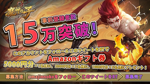 放置の王道MMORPG『魔神の子‐放置の幻想大陸‐』は事前登録15万人突破!突破記念としてTwitterでアマゾンギフト券抽選キャンペーンを開催!