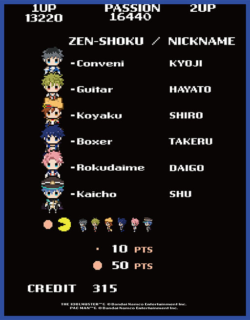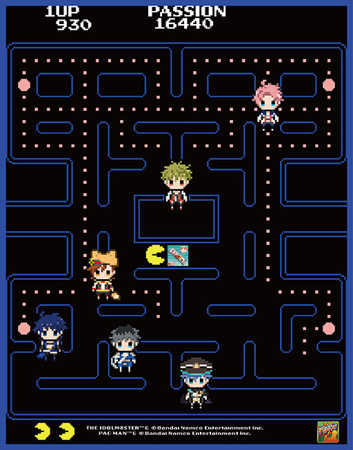 「アイドルマスター SideM」からはゲームが大好きな315プロダクション所属のアイドル、鷹城 恭二(Beit)・秋山 隼人(High×Joker)・橘 志狼(もふもふえん)・大河 タケル(THE 虎牙道)・天峰 秀(C.FIRST)の5人が「パックマン」のゲーム内にドット絵として登場しております。