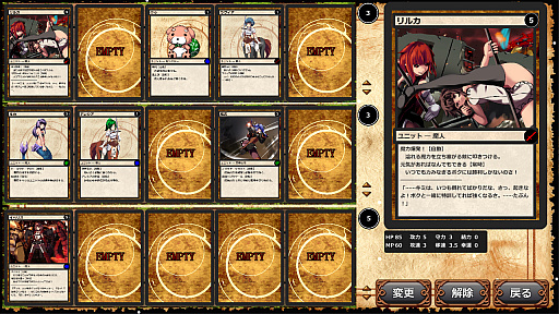 すべてのユニットやアイテムはカードとして表現されており、シミュレーションゲームにおけるユニット生産などの内政要素は、200種類以上のカードを組み合わせるデッキビルド要素として表現されています。