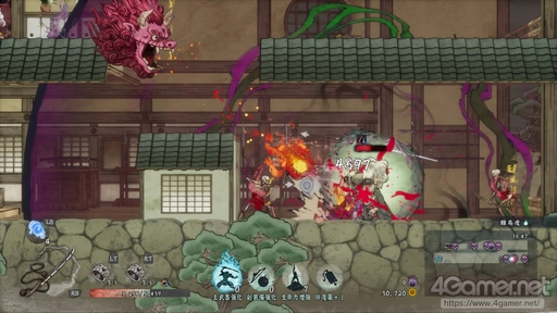 とくに厄介なのが輪入道。これの突進はなかなか回避のタイミングが取りにくく,またぶつかってしまうと継続ダメージが発生する炎上状態になってしまう。ボスの大百足は攻撃パターンが多いので覚えることが多く,こちらも継続ダメージとなる毒状態を受ける可能性があるので,勝てたとしても手負いのまま次のステージへ……となることも少なくないからだ。