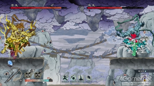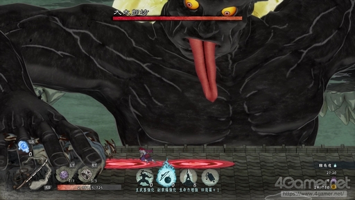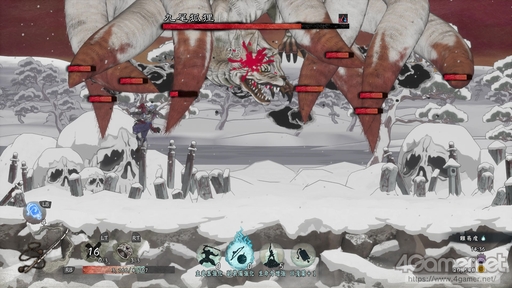 ボスは「九尾狐狸」。9つの尻尾のどれか1本を削り切ると怯み,3本を削り切るごとに本体に「殺」が狙える。狙った尻尾をジャンプして集中攻撃をするのが基本の戦い方で,複数のしっぽにまとめてダメージを与えられる箇所に攻撃できると効率が良い。広範囲にダメージを与えられる副装備があれば,バトル開始後すぐに使用することでだいぶ戦いが楽になる。