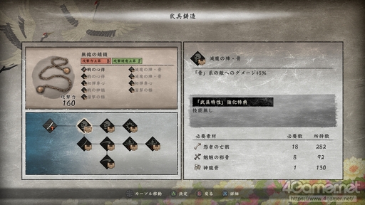 「技能解放」の上1列「戦の心得」は解放しておくと攻撃力が+20となる。必要な素材である「鬼牙」と「魍魎の邪骨」がステージの周回だけでも手に入るので,開放しやすいのもポイントだ。楽な割に効果は絶大で,道中にある商店のNPCで「活性化」し,「武具段位補強」で段位を上げるだけで「辺獄の忌地」はもちろん次の2つのステージも格段に楽になるだろう。