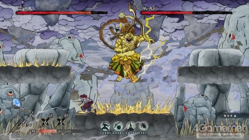 また,最後のステージだけあって,敵の強さは覚悟が必要だ。狙いを定めて空から急降下してくる「死蘇鳥」や剣を振って衝撃波を放つ「鎧霊鬼」など,強力な一撃を持つ敵がたくさんいる。とくに「鎧霊鬼」は,画面外からも衝撃波を放ってくるので,放置せずにしっかり倒しておきたい。