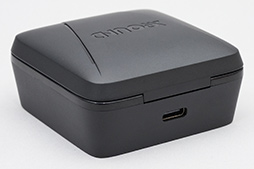 充電ケースは実測で54×54×25mmのサイズで,やや厚みはあるもののコンパクトと言っていい。前面にLEDインジケータがあり,充電ケースのバッテリー残量が分かる仕組みだ。背面には充電用のUSB Type-Cポートがある。