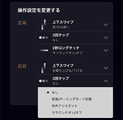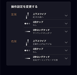 タッチセンサーは,左右のユニットで別々に設定できる。デフォルトでは,以下に示すスクリーンショットのようになっていて,MyTuneがなくても,音楽モードとゲーミングモードの切替や,XROUND Liteのオン/オフが行える。左ユニットを2秒間タッチしているとXROUND Liteのオン/オフ,右ユニットを2秒間タッチでモードの切替と覚えておくだけでもいい。