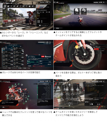 本作のメインのゲームモードとなるキャリアシミュレーションモードでは,カレンダーからレースやトレーニングを選択して,チームやライダーを強化・育成していくことになる。レースで集めた賞金で,新しいバイクやパーツを購入することで,自分の理想に合わせたマシンセッティングができるという。また,研究開発部門へ投資することで,チームのスキルアップも可能で,スキルツリーのアンロックをどう進めるかによって,レースのパフォーマンスや戦略も変わってくるようだ。