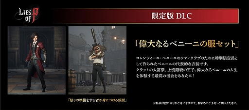 限定版には、ゲーム内で使用できる衣装DLC「「偉大なるベニーニの服セット、祭りの準備をする者が身につける仮面」が付属いたします。