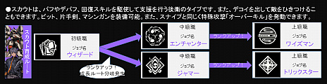 スカウトは、バフやデバフ、回復スキルを駆使して支援を行う後衛タイプです。また、デコイを出して敵をひきつけることもできます。ビットによる攻撃は、障害物を無視して敵に届くのもメリットです。スナイプと同じく特殊攻撃「オーバーキル」を発動できます。初級職はウィザードであり、こちらを起点に味方を強化してサポートを行うエンチャンター系か敵へのデバフと状態異常付与で戦力ダウンさせるジャマー系へと派生していきます。