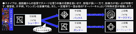エースシューター:ヘイトコントロールと回避を重視して狙撃を行うジョブ。回避率、命中率を大きく上げるアクティブスキルを持ち、積極的に前線で戦うことができます。