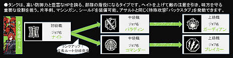 タンクは、高い防御力と豊富なHPを誇る、部隊の盾役になるタイプ。ヘイトを上げて敵の注意を引き、味方を守る重要な役割を担います。アサルトと同じく特殊攻撃「バックスタブ」を発動できます。初級職はナイトであり、こちらを起点に強固な盾役のパラディン系か司令塔役のコマンダー系へと派生していきます。