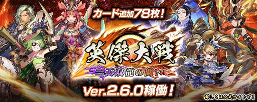 本日稼働開始した「Ver.2.6.0」では、全78枚のカードを追加。さらに、戦闘バランスの調整、群雄伝の新シナリオやカスタマイズアイテムの追加など様々な面で進化し、より奥深く楽しめるバージョンとなっております。
