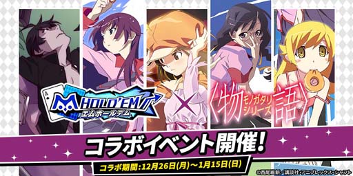 サミー株式会社のスマートフォン向けテキサスホールデムポーカーアプリ「m HOLD’EM(エムホールデム)」は『〈物語〉シリーズ』とのコラボイベントを2022年12月26日(月)から2023年1月15日(日)まで開催いたします。