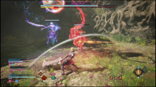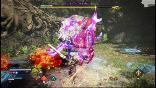 ステージのラストには,火と水,2つの属性を持つボス「コアエレメント」が登場。火の「ラフム」と水の「ラハム」がコアとなる球体から現れ,異なったパターンの攻撃を繰り出してくる。ソウルバーストで球体を破壊すると,両者が合わさった「メルティエレメント」の姿となり,2つの属性の攻撃を同時に行ってくる。これを倒したところで,今回の体験版は終了となった。