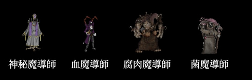 ではどうしようかと考え,最初は「火炎魔導師」「冷気魔導師」といった「〜魔導師」という形でのネーミングを考えました。しかしなにせいろんな種類があります。全部が全部この形でうまく収まるわけではありませんでした。そのまま原文の意味をくっつけていくと「腐肉魔導師」「血魔導師」「菌魔導師」といった名前になってしまい,正直ダサい。