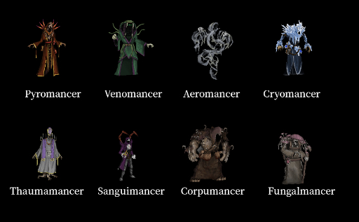 その数,全部で21種類。なんとも沢山の「〜mancer」が登場するというわけです。「mancer」というのはネクロマンサーなどの言葉でも知られるように,術の使い手などを呼称する際に使われる言葉です。ここではその前に「Pyro(火)」や「Venom(毒)」など,それぞれの属性を示す言葉がつくことで名前を構成しています。