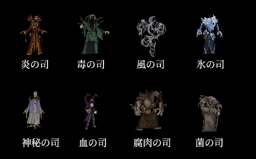 つまり「炎の司(ほのおのつかさ)」「毒の司(どくのつかさ)」といった感じで,「〜の司」という形にする。そうすればいかにバリエーションが多くとも「腐肉の司」「血の司」「菌の司」と,どれを当ててもそれなりに恰好がつき,統一感も維持できます。よし,これで行こうとなりました。