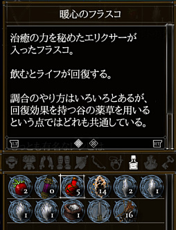 アイテムの効能としてはライフが回復するというものだったので,「暖命のフラスコ」とかでもよかったのですが,命を暖めるという表現にはなじみがなく,無理矢理当てた言葉のようにも感じられたので却下としました。また「だんめい」という響きが「断命」と同じなので,声に出して読んだときにあまり癒されそうな感じがしないというのも気になりました。それよりはと,暖炉の暖かさで癒されるような薬,というイメージで「暖心」にした,という感じです。