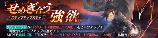 リン・ヤオと融合したグリード「グリード(強欲な二つの魂)」が新登場するステップアップガチャ「せめぎ合う強欲」が開催!ステップ5で無料10連、ステップ9では10連ガチャ中にSSR「グリード(強欲な二つの魂)」が1体確定で獲得できます。