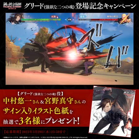 株式会社スクウェア・エニックス(本社:東京都新宿区、代表取締役社長:松田 洋祐、以下スクウェア・エニックス)は、スマートフォン向けゲーム『鋼の錬金術師 MOBILE』につきまして、本日3月23日(木)より新ユニット「グリード(強欲な二つの魂)」が登場しましたことをお知らせいたします。あわせて、「グリード(強欲な二つの魂)」を担当する声優の中村悠一さん・宮野真守さんのサイン入りイラスト色紙が当たるプレゼントキャンペーンの開催、メインストーリー第20話「墓前の父」を公開いたしました。
