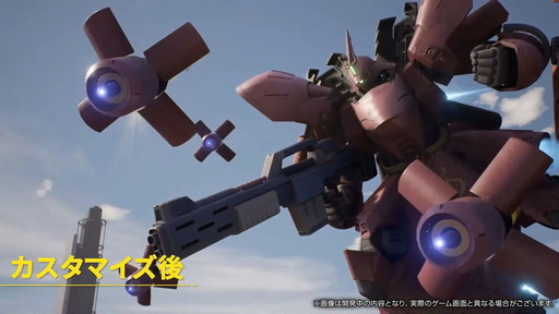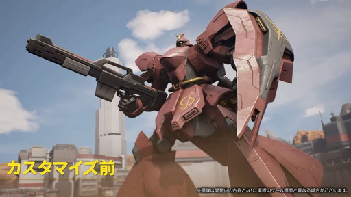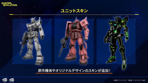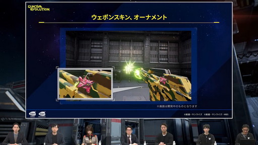 「ユニットスキン」はユニットの見た目を変えられる。G-3ガンダムやシャア専用ザクといった原作再現に加え,オリジナルのものも用意されるという。このほか,武器の見た目を変える「ウェポンスキン」と武器に付ける飾りフィギュア「オーナメント」が登場。ウェポンスキンは原作再現と季節イベントなどの二軸で展開する予定だという。オーナメントは通常のFPSでは良く見られるが,ガンダムゲームとしてはユニークな要素だ。公式番組ではデフォルメされたガンダムとサザビーのフィギュアが確認できた。