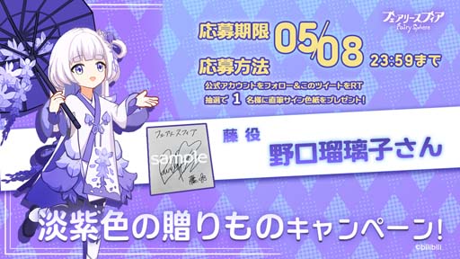 現在フェアリースフィアの公式Twitterでは豪華キャストの直筆サイン色紙が当たるキャンペーンを実施中です!開催中の復刻イベント「花咲く季節」にも登場している妖精の「藤(CV:野口瑠璃子)」や「紫陽花(CV:久保田ひかり)」の他、「ラベンダー(CV:久保田梨沙)」「ブルーベリー(CV:大下菜摘)」の4名の直筆サイン色紙が登場!