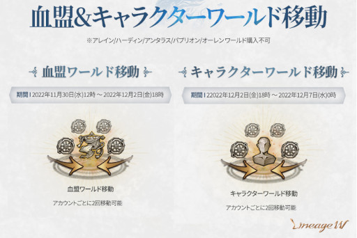 本日12時より、「血盟ワールド移動」を、12月2日(金)18時より「キャラクター ワールド移動」を開始します。