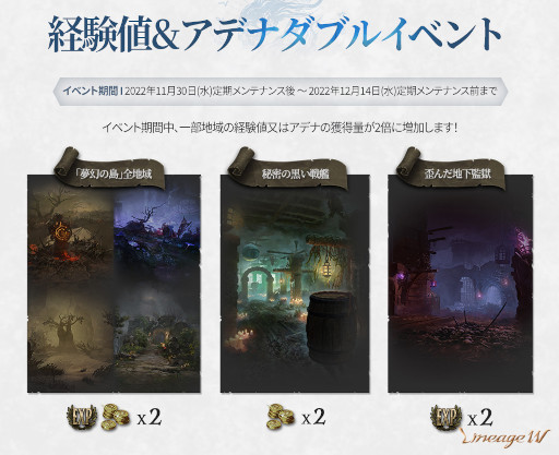 イベント期間中、「夢幻の島」全地域において、経験値獲得量とアデナ獲得量が2倍となります。また「秘密の黒い戦艦」ではアデナ獲得量が、「歪んだ地下監獄」では経験値獲得量が2倍となります。