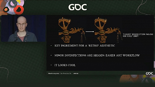 そのための秘密兵器が,いくつか紹介された。まず,画像を縮小してピクセルを目立たせることだ。画像を960×540ドット程度に縮小することで,法線のアラや,影とモデル間の隙間などをうまく誤魔化すことができたという。ディテールが減っても,そうした見た目のほうが好きだったとMullins氏は語る。レトロの美学だそうだ。