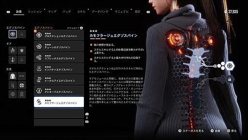 装備には「エグゾスパイン」と「ギア」の2種類がある。エグゾスパインは,イヴの戦闘スタイルに影響をもたらすもので,攻撃系ならコンビネーションの強化やダメージを減少させるものなどがある。