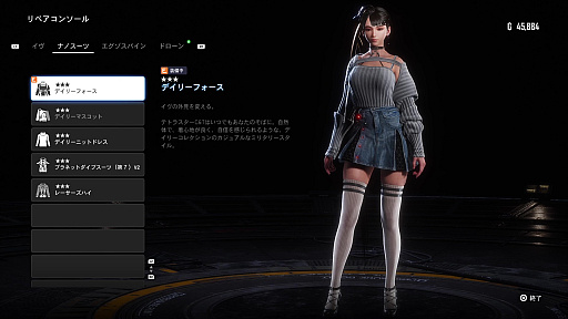 イヴが作中で着用している「ナノスーツ」は,ストーリーや性能にまったく影響しない外見を変えるだけのコスチュームだ。しかし,新たなものを手に入れたときは,何よりも早く着用した姿を見たくなるのも,本作ならではの魅力だろう。