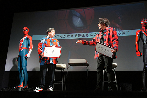 2人には,スパイダーマンシリーズにちなんだ質問もいくつか投げかけられた。「もし自身がスパイダーマンになれたらやってみたいこと」というお題には,盛山さんが「空から交通整理して,高速渋滞を解消してあげたい。スパイダーマンの格好で確定申告にも行ってみたい」と答える。