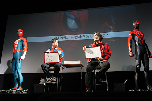 続いて登場したのは,見取り図の盛山晋太郎さんと,霜降り明星のせいやさんだ。ピーター・パーカーとマイルズ・モラレスをイメージした衣装を纏った2人は,ゲーマーかつ,マーベル作品ファンだということで,ステージに置かれたスパイダーマンのスタチューに大興奮していた。