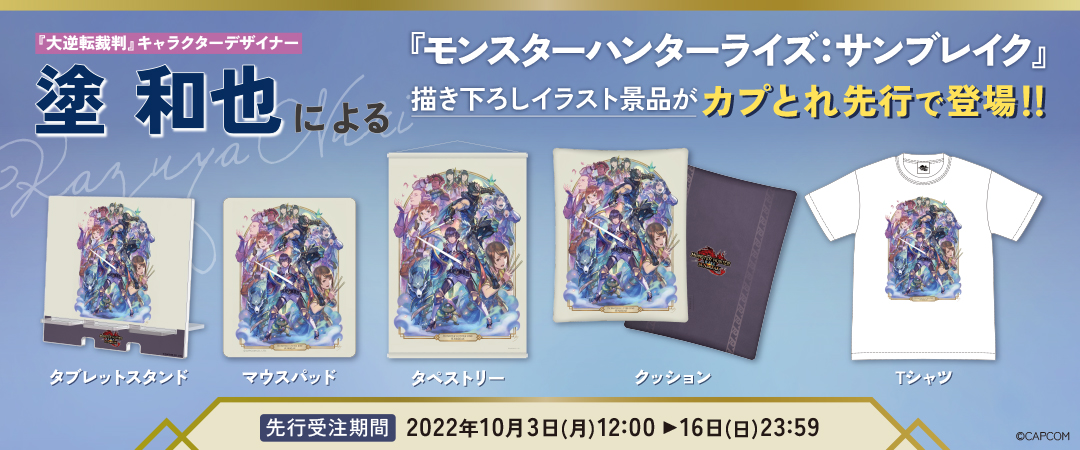 「大逆転裁判」のキャラクターデザイナー,塗 和也氏描き下ろしの「モンハンライズ:サンブレイク」のグッズが登場