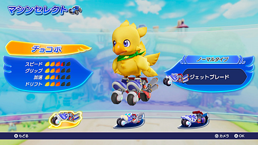 ゲームモードは,4つのコースを走って総合順位を競う「シリーズレース」や,遊び方を自由に設定できる「カスタムレース」,自己ベストなどに挑戦できる「タイムアタック」,トーナメント形式で行われるオンラインレース「チョコボGP」などが用意されている。