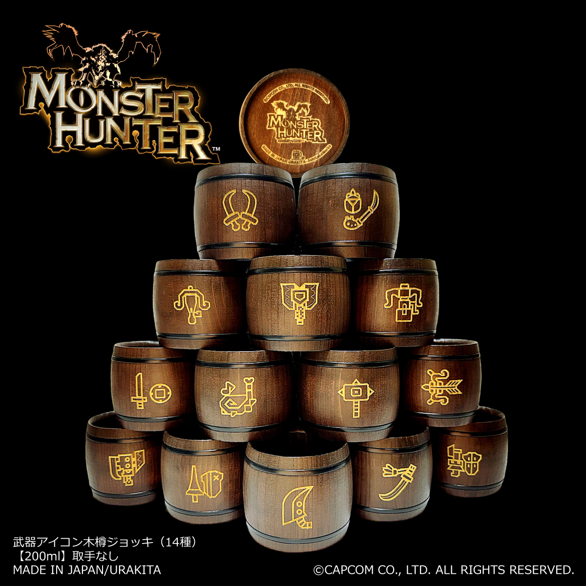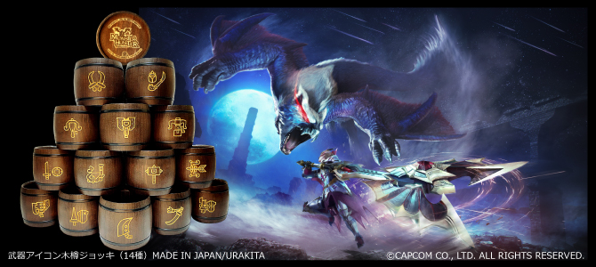 「モンスターハンター」の武器アイコンをデザインした“木樽ジョッキ”全14種が発売に