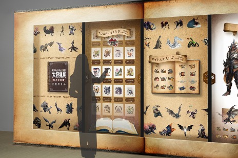 歴代ナンバリングタイトル17作品の映像を一挙に振り返ることのできる「アニバーサリーシアター」。大画面の映像と積み重ねた歴史を表したマルチモニターがハンターの皆さんをお出迎えします。モンハンの記憶を呼び覚まし、一気にモンハンの世界に引き込みます!