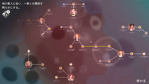 「マインドマップ」と呼ばれるシステムが特徴の1つで,屋敷を探索したり,容疑者と話をしたりして得られた手がかりをこのマップ上でつなぎあわせ,可視化できるのだ。