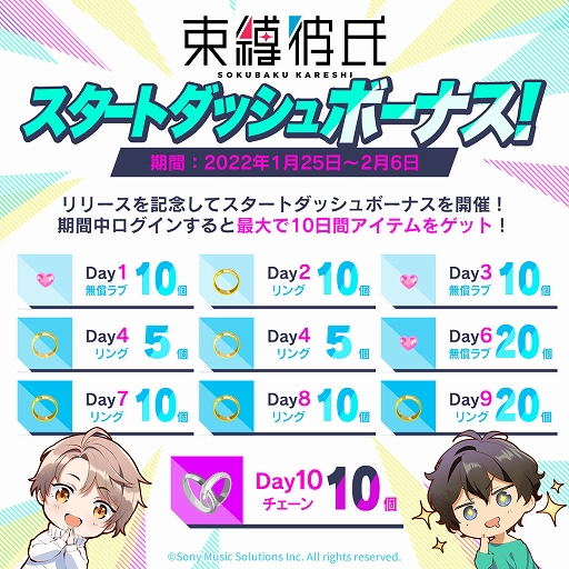 新しく「束縛彼氏」をスタートするユーザーの応援のため「スタートダッシュボーナス」を開催します。こちらは2022年1月25日(火)から2月6日(日)までの間にログインしていただくと自動的にアイテムを入手できるキャンペーンです。
