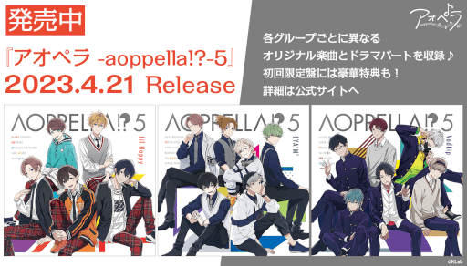 4月21日(金)にプロジェクト5枚目のCD「アオペラ -aoppella!?-5」が、発売されました。今回発売される「アオペラ -aoppella!?-5」は、リルハピ、FYA'M'、新グループVadLipのグループ毎に仕様が異なり、それぞれのデザインジャケット、オリジナル楽曲とドラマパートが収録されています。