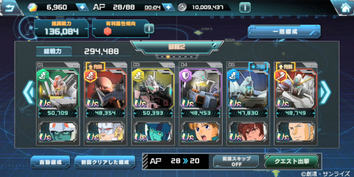 クエスト出撃前には部隊のMS出撃配置を決めることができ、強い敵に集中して攻めるような配置にしたり、MSごとのタイプにあった配置にして戦闘力の底上げをするといった自分ならではの戦略性を考えて楽しめます。