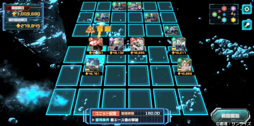 本作は,3Dのモビルスーツによる6vs6のウォーシミュレーションゲームアプリで,プレイヤーはモビルスーツ最大6機とパイロットキャラクターを自由に編成し,敵部隊に合わせた出撃配置を決定する。戦闘自体はオートバトルで展開するので,戦略性を楽しむ内容となるようだ。