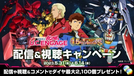 2023年5月30日に『機動戦士ガンダム U.C. ENGAGE』は皆様のおかげで1.5周年を迎えました。それを記念し、現在「1.5th Anniversary記念キャンペーン」を開催中です!期間中は、ダイヤ6000個が手に入る限定ログインボーナスや特別実績などが開催されます。